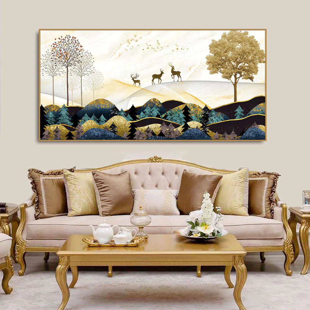Abstract Golden Landscape Trees with Golden Deer Canvas Wall Painting