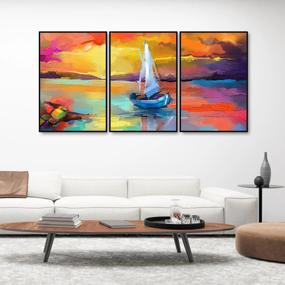 Beautiful Colorful Sea with Ship Premium Floating Wall Painting Set of Three