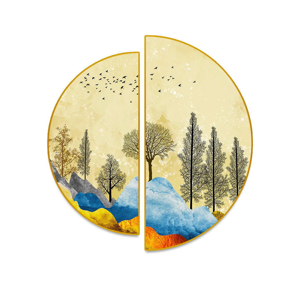 Beautiful Mountain Landscape with Trees and Birds Semi Circle Canvas Wall painting