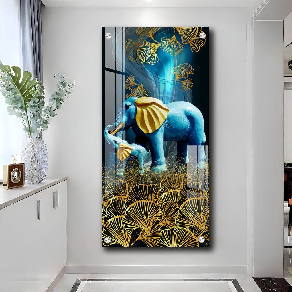 Crafted from high-quality acrylic, this piece offers a glossy finish that enhances the intricate details and rich colors of the elephants, creating a visually stunning and enigmatic effect. The vertical orientation makes it ideal for narrow spaces, such as hallways or above furniture, fitting seamlessly into various decor styles.