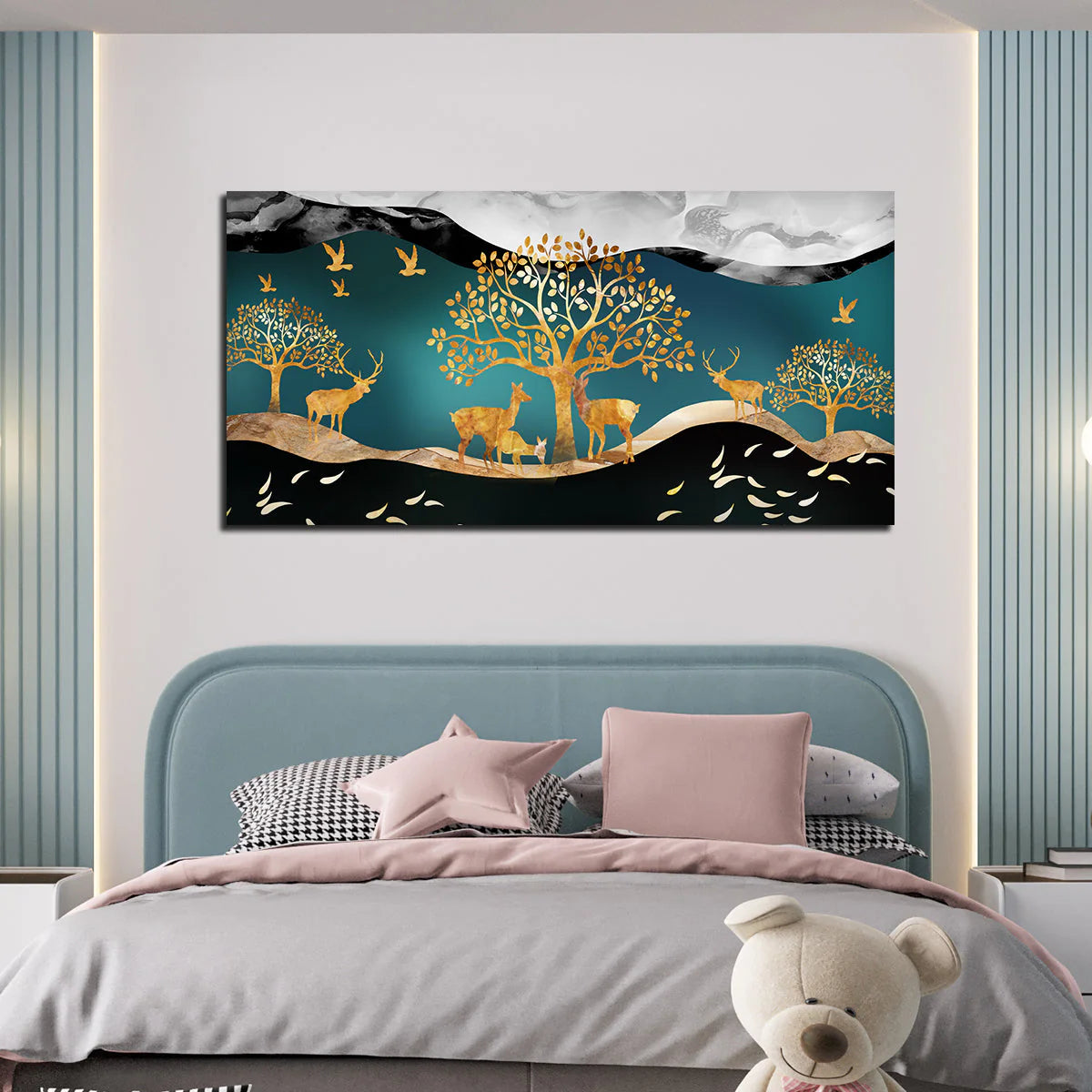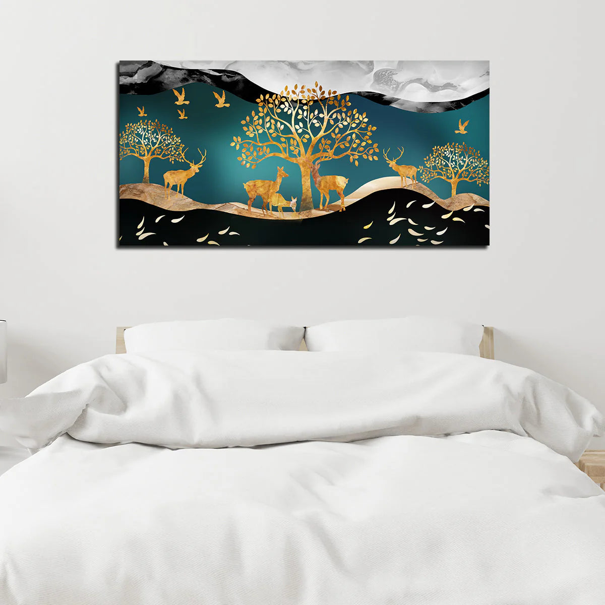 Canvas Wall Painting of Golden Trees With Birds And Deer