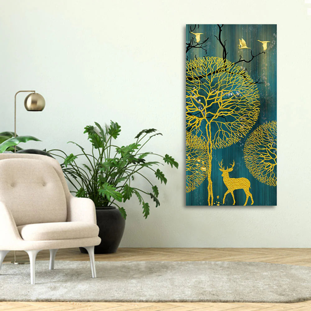 Golden Nightscape with Deer and Golden birds Canvas Wall Painting