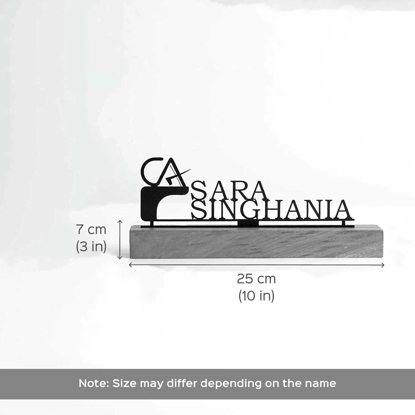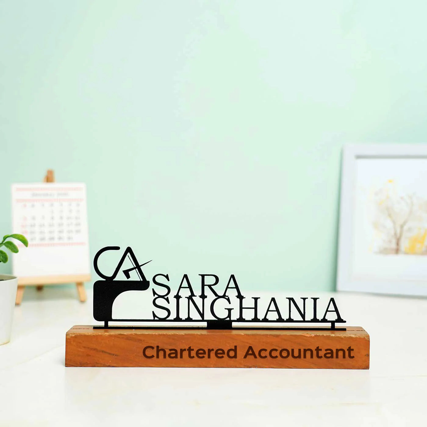 Upgrade your professional workspace with this Personalized Desk Metal Name Plate for Chartered Accountant, designed to reflect elegance, credibility, and professionalism. Crafted using high-quality mild steel and mounted on a sturdy teak wood base, this desk name plate combines durability with premium aesthetics.