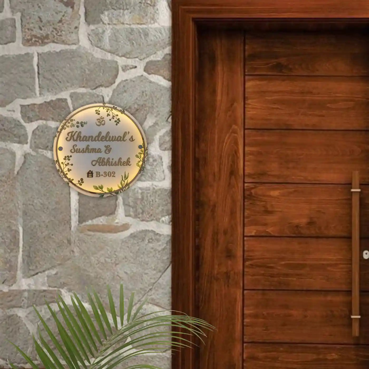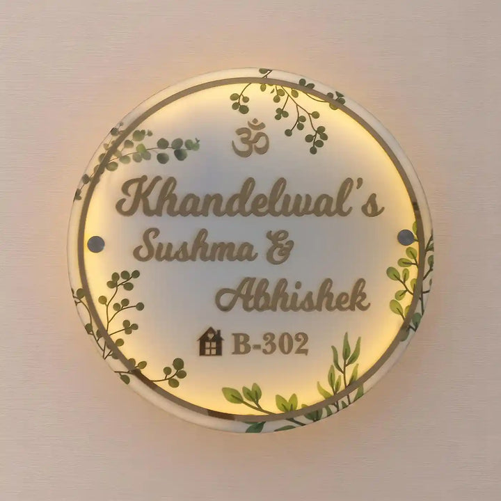 Personalized Handmade Leaf Printed Circular Acrylic Name Plate With Lights