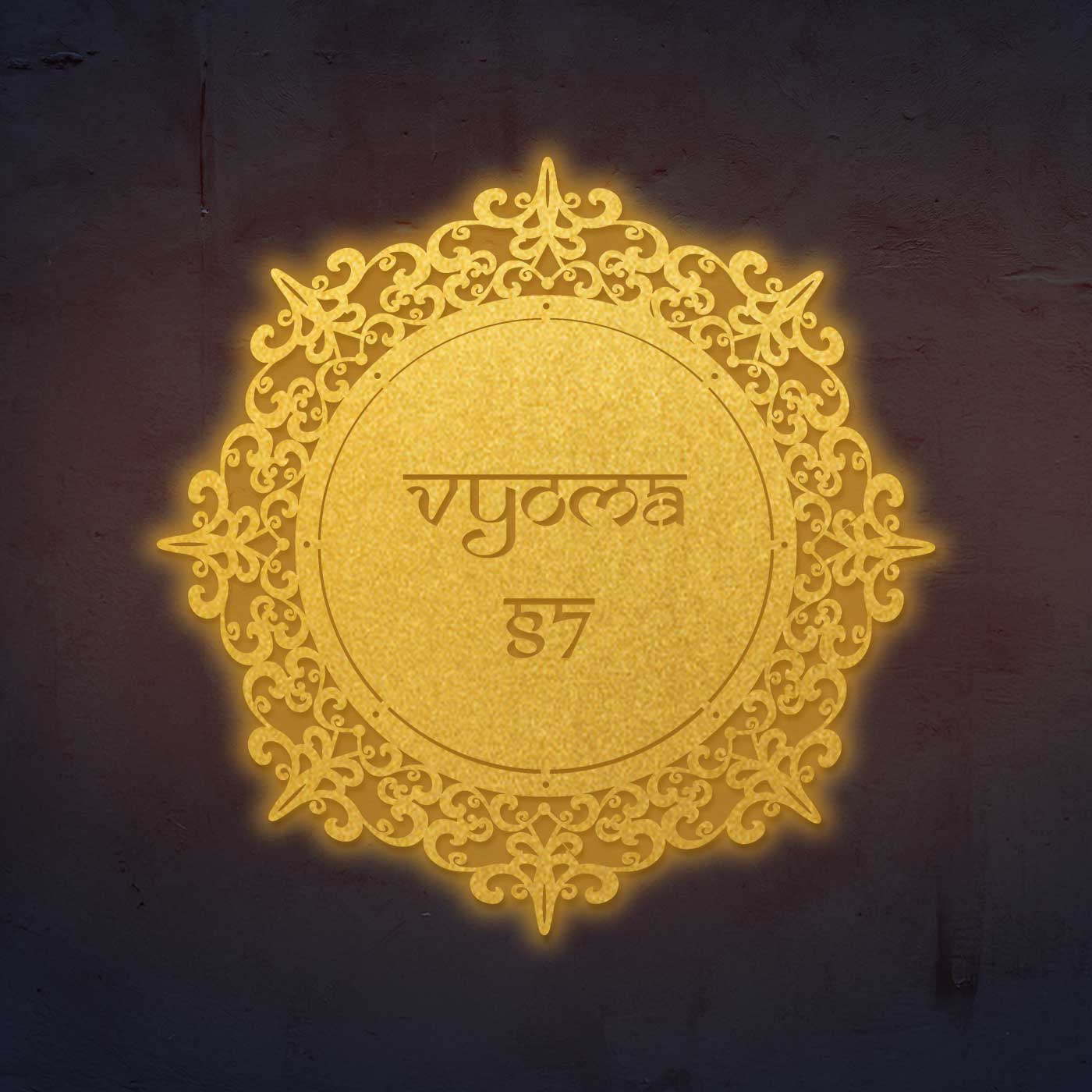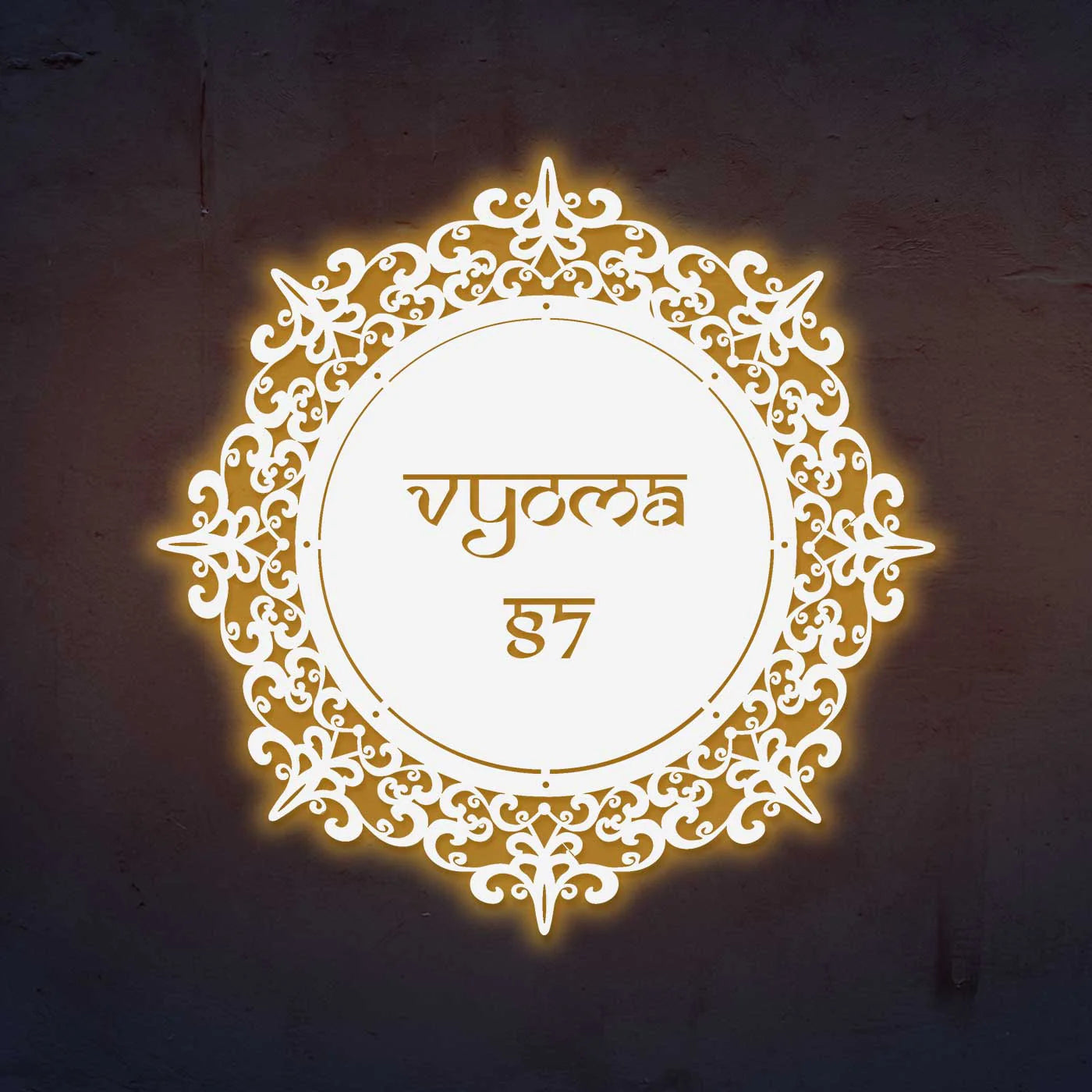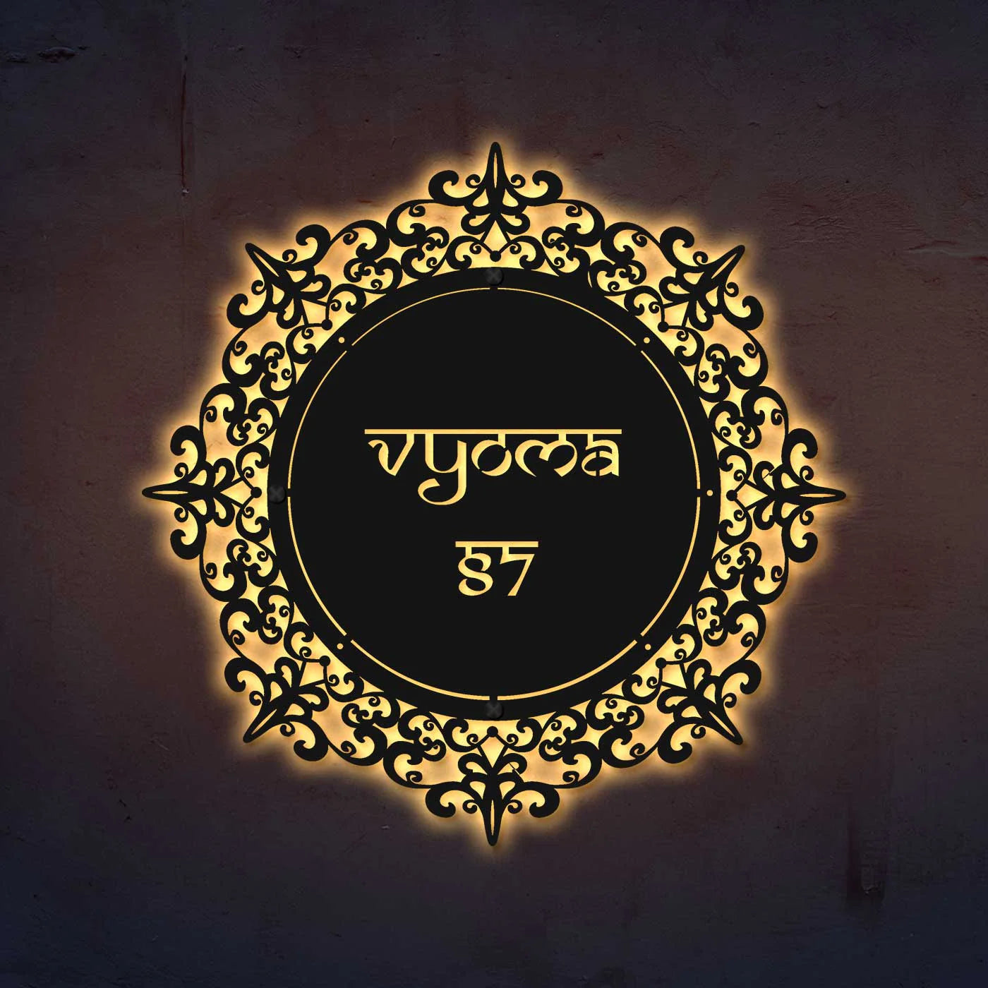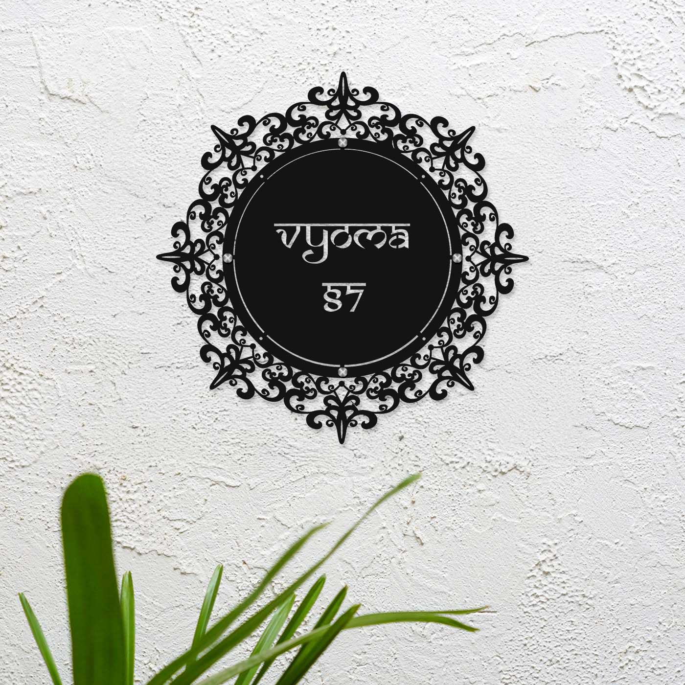 Crafted from 16-gauge mild steel, this metal name plate features a premium powder-coated finish that protects against rust and weather damage. Its round laser-cut design makes it a perfect metal name plate design for home, suitable for both indoor and outdoor placement.