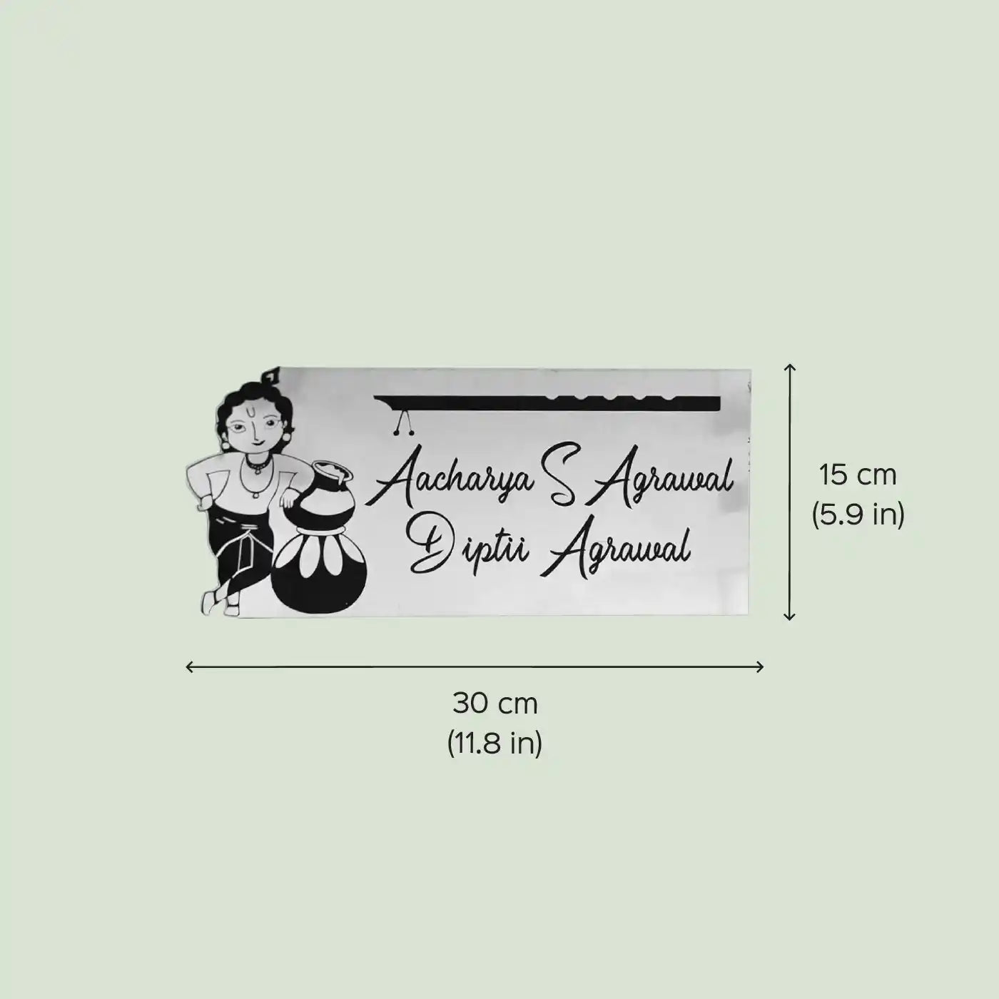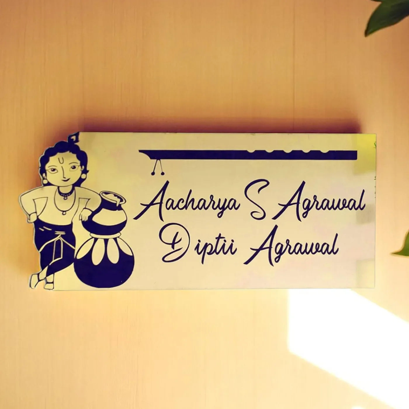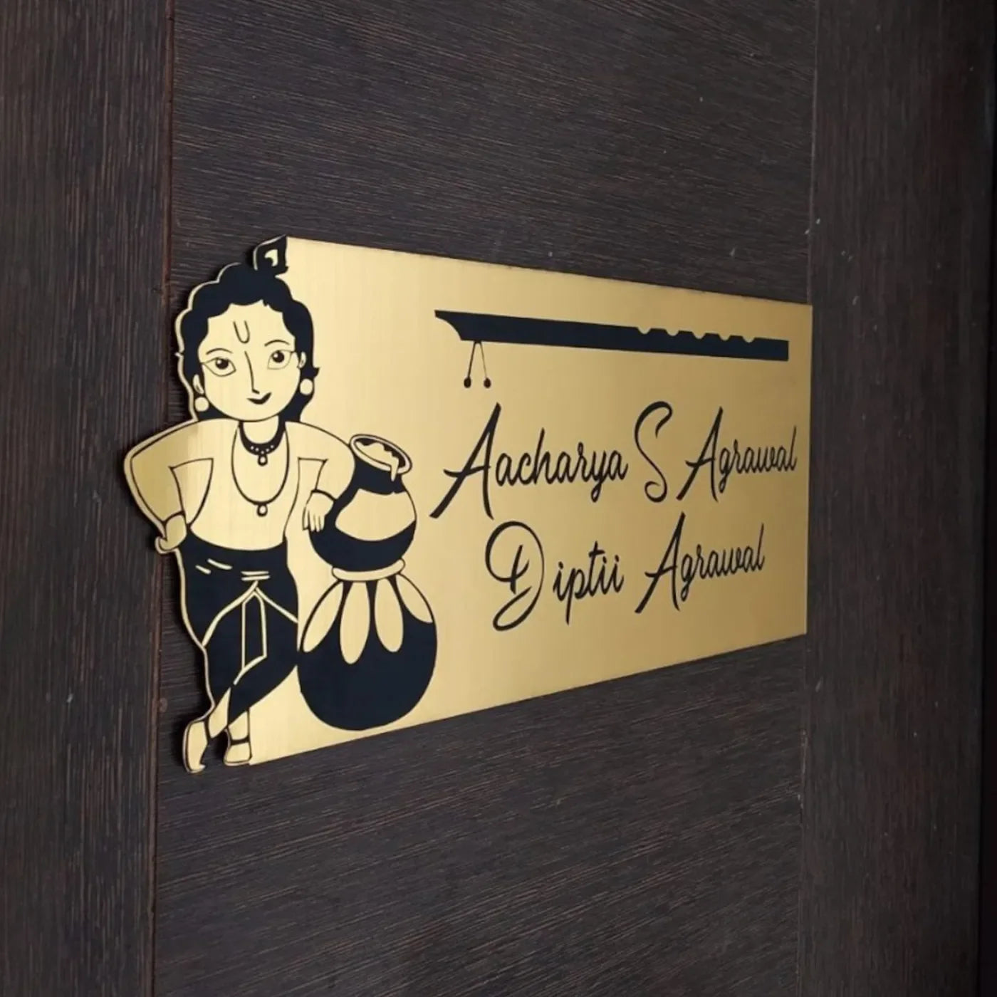 Bring divine elegance to your entrance with this personalized metal name plate for home, beautifully designed with a Krishna theme that symbolizes peace, joy, and spiritual grace. Crafted from premium stainless steel, this name plate features a radiant golden mirror finish that enhances the beauty of any home.