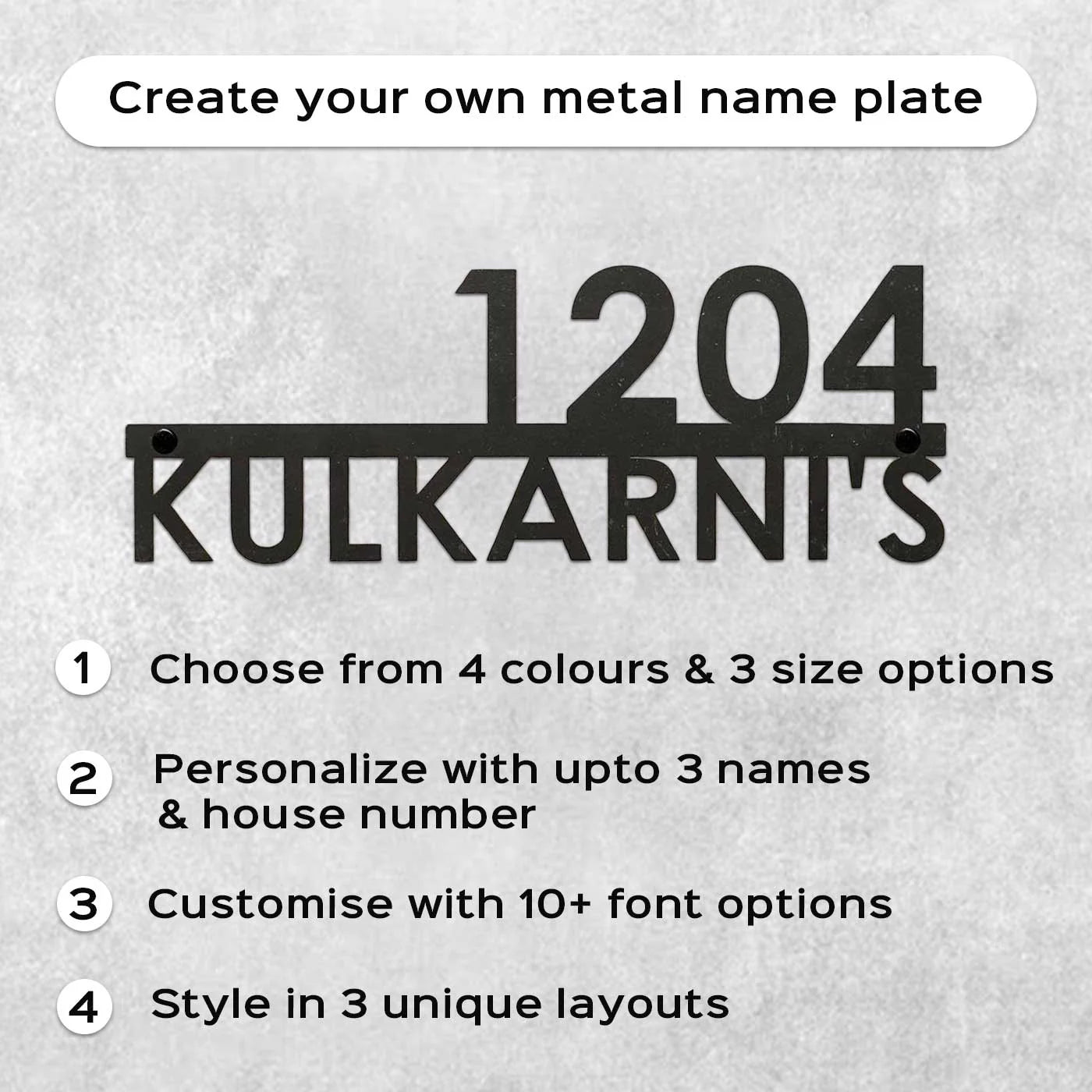 Give your home entrance a premium makeover with this Personalized Metal Name Plate for Home, designed for durability, elegance and long-lasting performance. Made from 16-gauge mild steel, this modern weatherproof name plate is perfect for any home, apartment, villa or office.