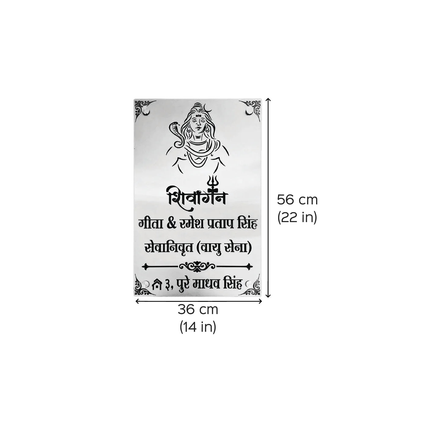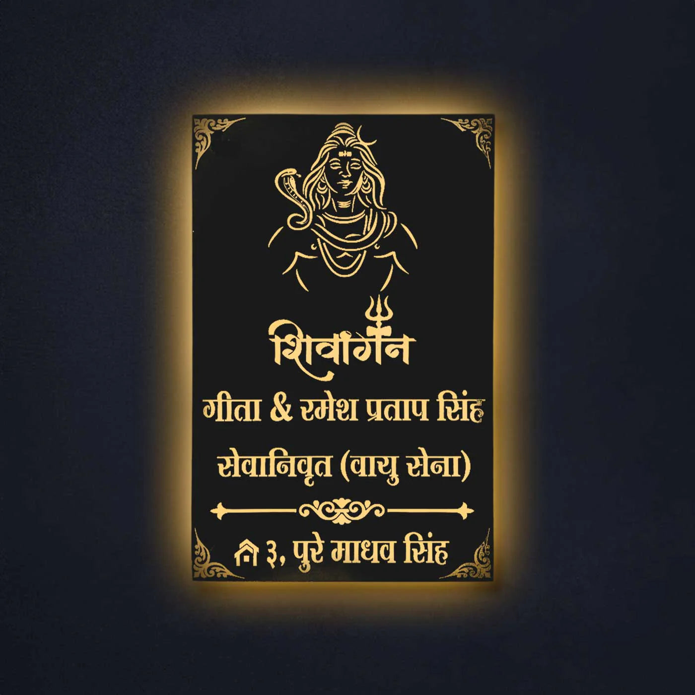 Featuring a beautifully crafted Shiv Ji design, this personalized metal name plate comes with integrated LED lighting that enhances visibility at night. The warm white LED lights are placed discreetly at the back, creating a glowing effect without exposing the wiring or LEDs from the front.