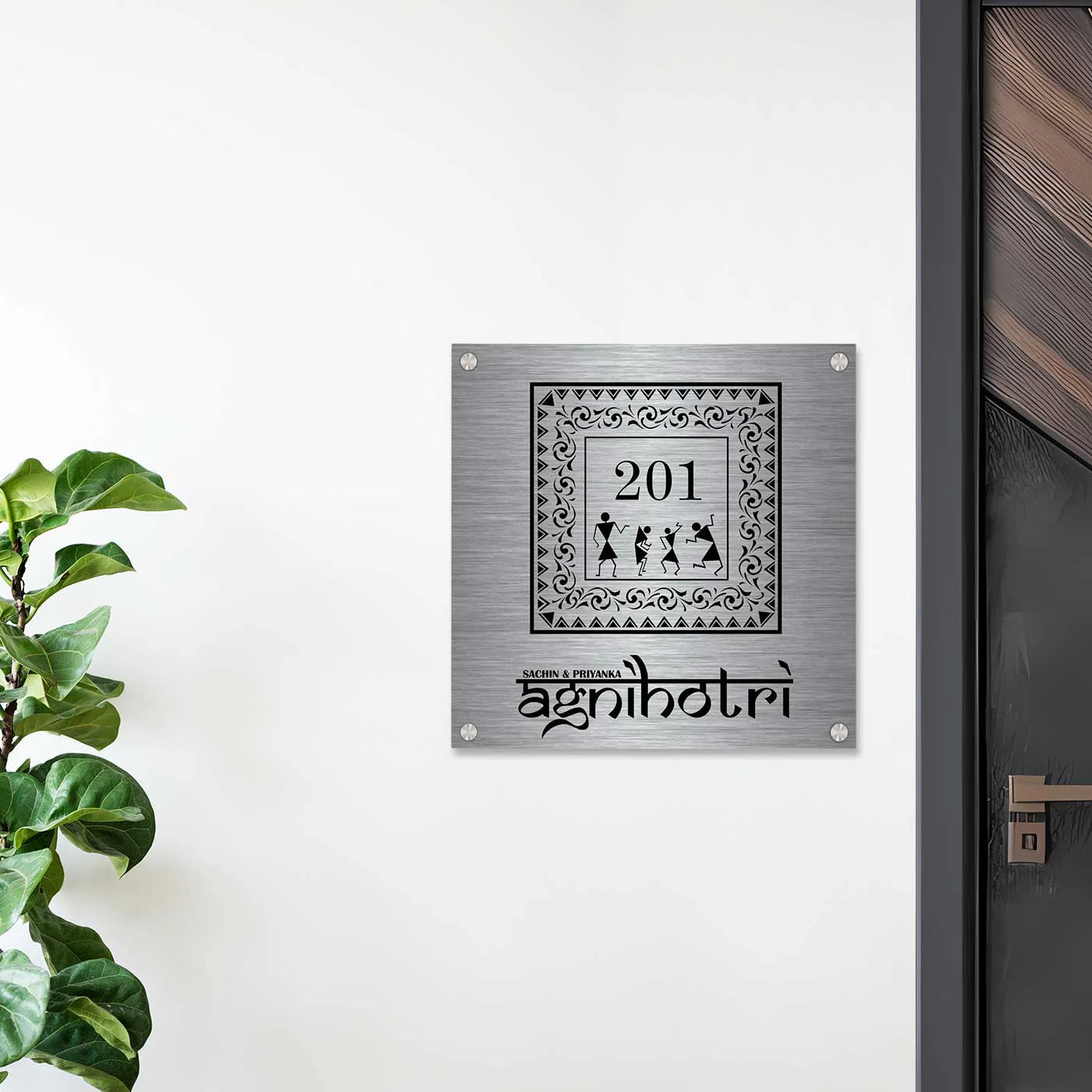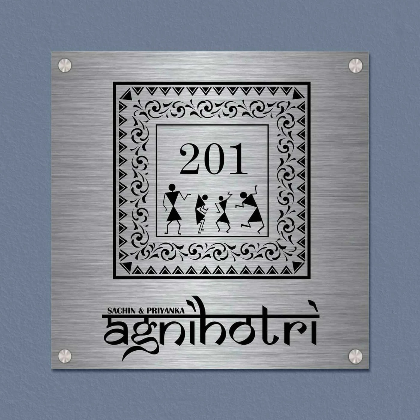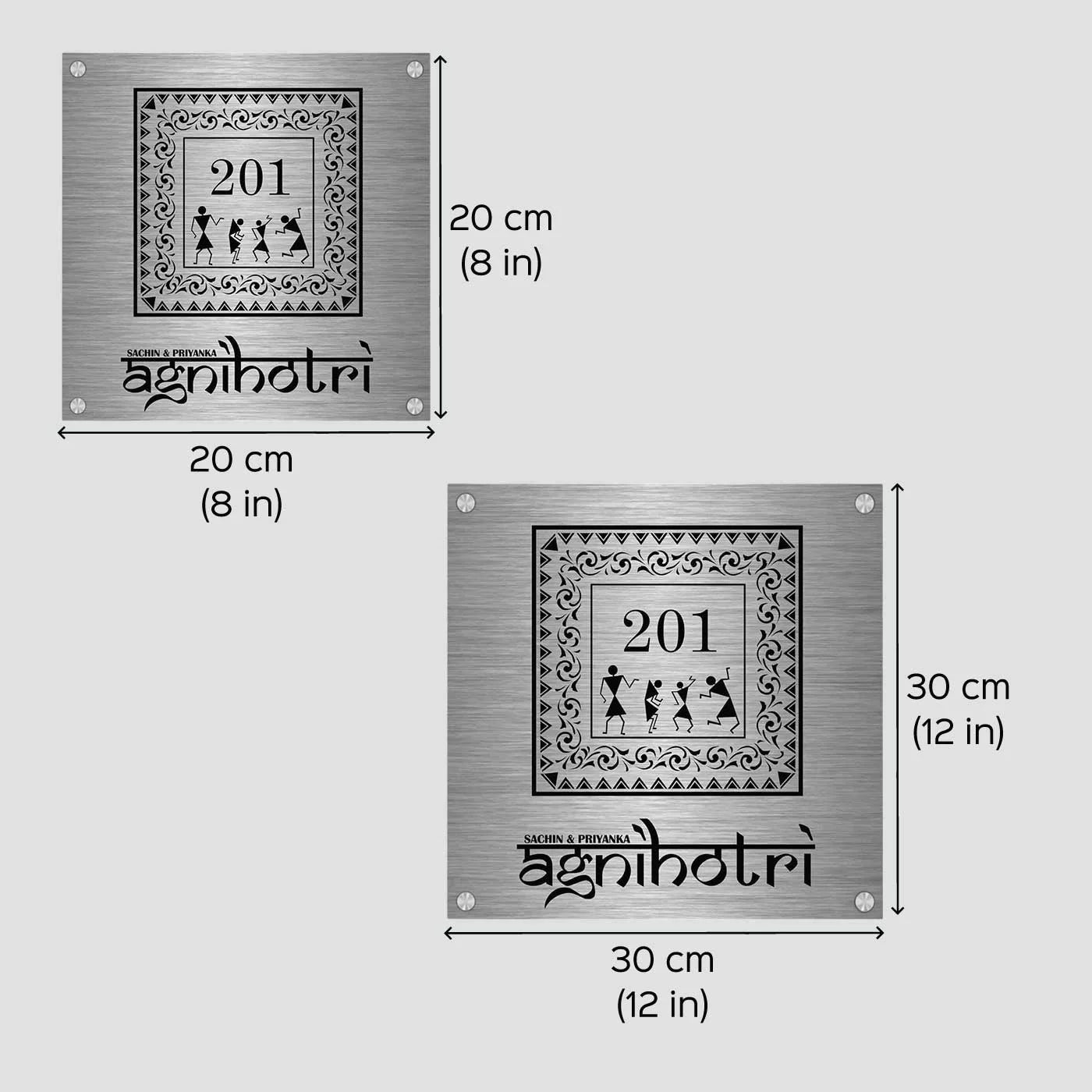 Enhance your home entrance with our Personalized Warli Art Stainless Steel Metal Name Plate for Home, a perfect blend of traditional Indian art and modern durability. Crafted from premium-quality stainless steel, this metal name plate for home entrance outdoor is designed to add elegance while ensuring long-lasting performance.