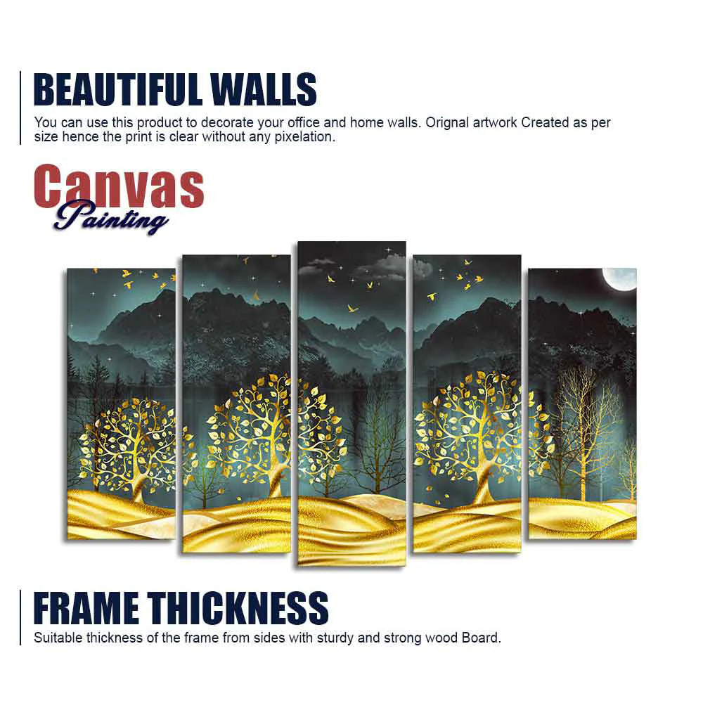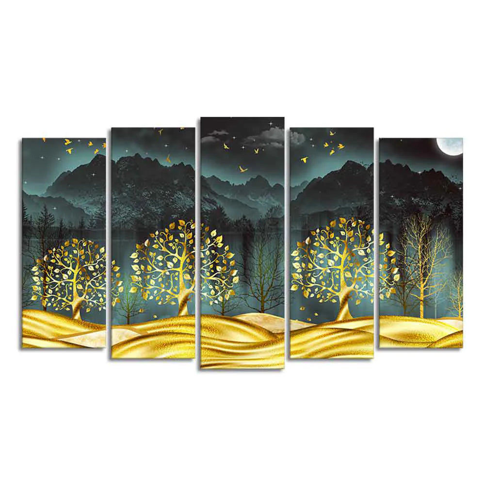 Wall Painting of Golden Trees in Dark Forest of Five Pieces Set